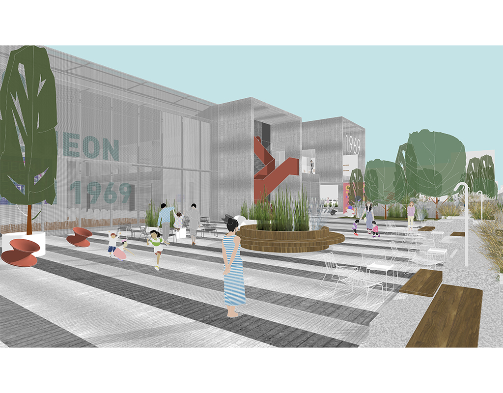 복합문화센터는 노후화되어 가고 있는 산업단지 중심부에 위치하고 있다. 대지로 접근하기 위한 보행로는 걷기 쉽지 않은 환경에 놓여있으며 빠르게 지나가는 자동차들과 대형 트럭들이 보행자들을 스쳐지나가고 있다. 녹슨 철판과 폐허가 된 듯한 용도가 사라진 건물들, 좁은 도로와 불법 주차들 사이에서 우리는 이질적인 풍경을 발견하고 공존하기를 바란다.